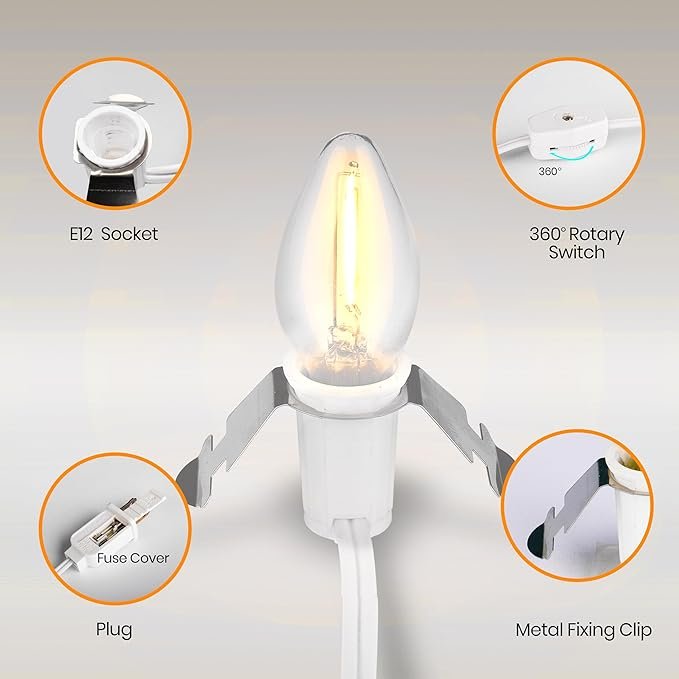 【Blow Mold Light Cord with Clip Bulb】 C7/E12 Candelabra LED Bulbs, 120V / 1W(saves more energy than incandescent bulbs), 25,000 hours lifespan, 50 Lumes, 2700K soft Warm White, non-dimmable, simply attach the clip to fix each bulb into christmas village house, halloween handmade pumpkin, craft village, craft projector, outdoor and home holiday decoration, lamp, and more.