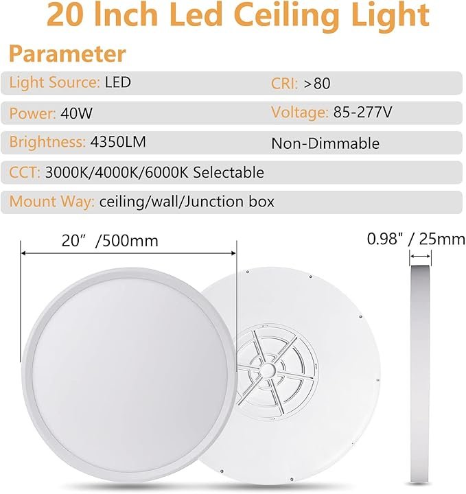 20 Inch LED Flush Mount Ceiling Light, 40W, 4350LM, 3000K/4000K/6000K CCT Selectable Super Slim Round Flat Panel Light for Living Room, Bedroom, Kitchen