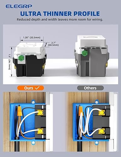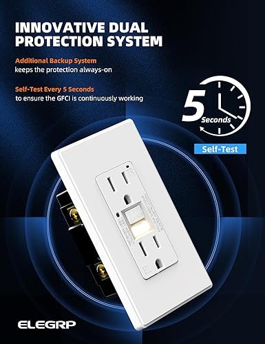✅【Easy Installation】Installing the ELEGRP GFCI outlet is not only safer but also easier. Designed with a thinner profile, it maximizes space for wires in the wall box. Replacing any standard receptacle is a breeze, taking as little as 10 minutes. It works with 12 or 14 AWG for side wire and back wire and is compatible with all electrical boxes, decora devices, and wall plates. A screw-less wall plate and comprehensive installation instructions are included for your convenience.