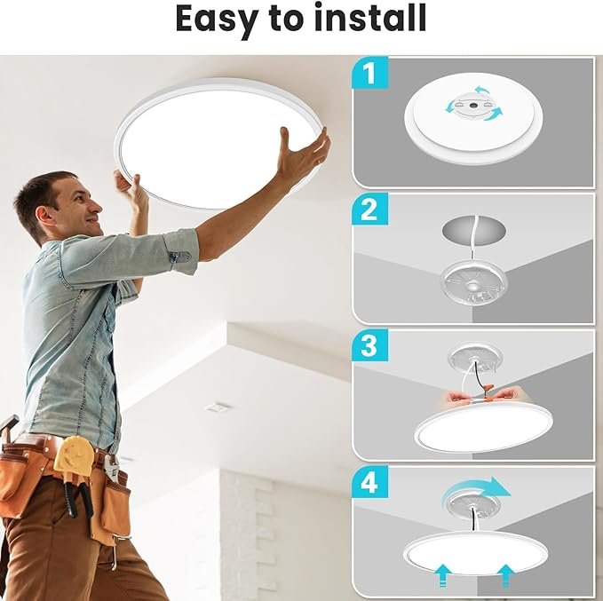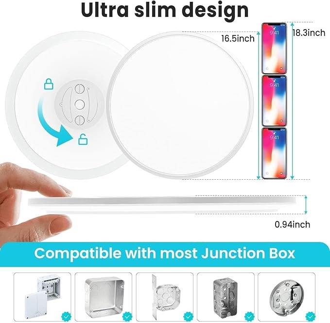 • Install is a Breeze:This white round bedroom lighting is hassle-free to install, eliminating confusion and tedious steps. The flat panel ceiling light base is designed with a rotating mounting plate, allowing for simple and quick installation.Attached security cable at the back serves an important safety function,preventing a full dislodge or fall.
