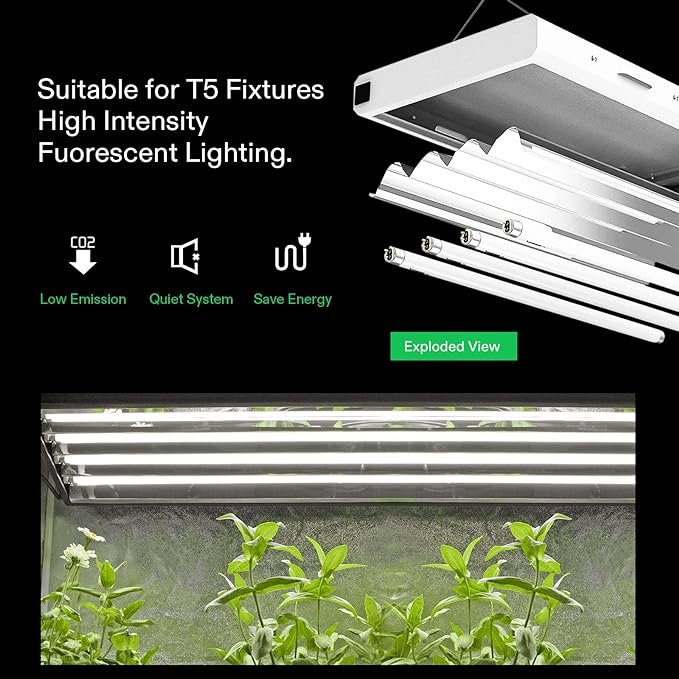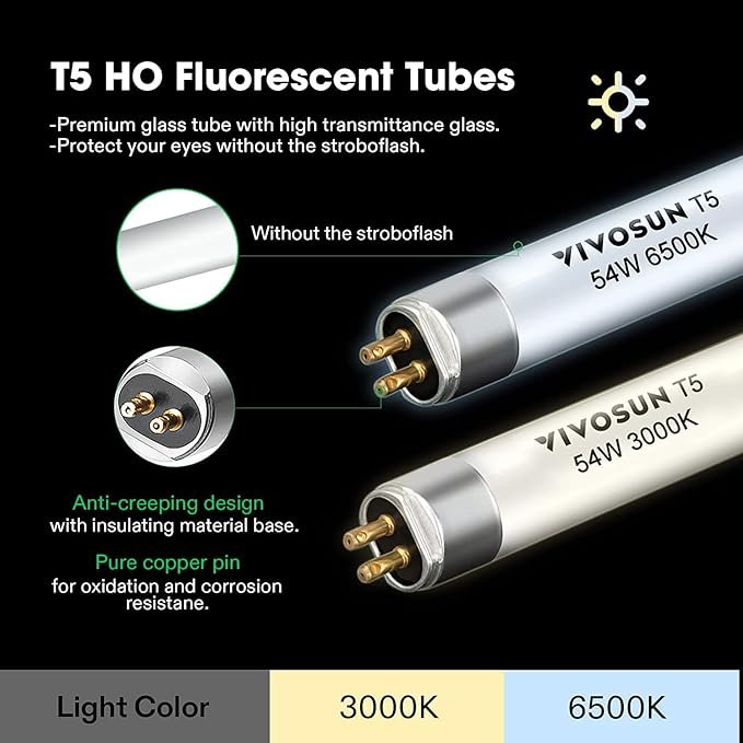 • Cool, Balanced Light: Premium Vivosun T5 lamps emit a balanced blue and violet spectrum at 6500K to promote vibrant vegetation and prevent stretching