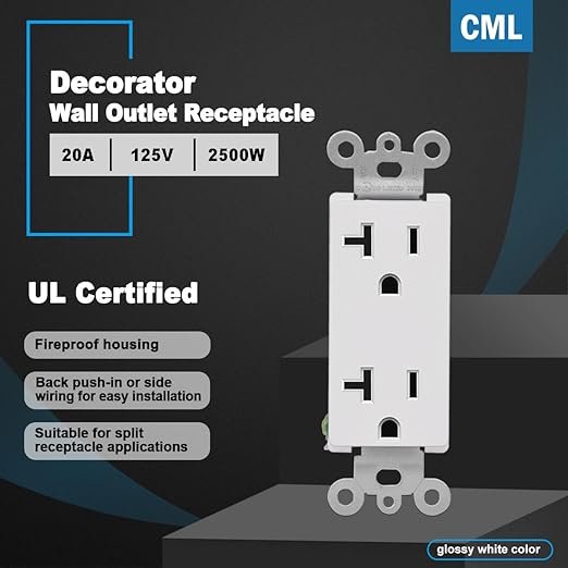 CML 20 Amp Decorator Wall Receptacle, Decor Electrical Outlets, 20A/125V, Residential and Commercial Use, Non-Tamper-Resistant, UL Listed, White, 50 Pack
