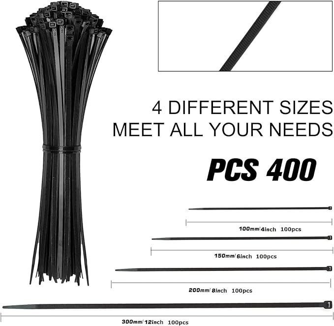 Cable Zip Ties,400 Pack Black Assorted Sizes 12+8+6+4 Inch,Multi-Purpose Self-Locking Nylon Cable Cord Management ,Plastic Wire Ties for Home,Office,Garden,Workshop. By HAVE ME TD