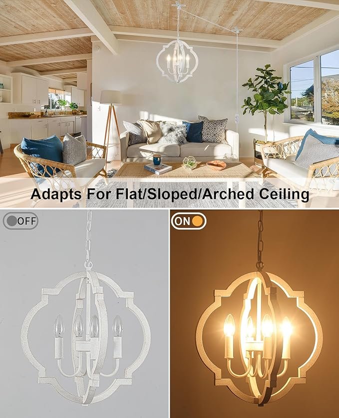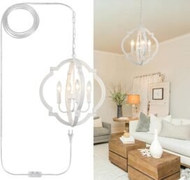 LASENCHOO Plug in White Farmhouse Chandelier Lighting with Long Cord, 4-Light Hanging Light Fixture Plug in Pendant Light for Ceiling, Wood Rustic Geometric Chandeliers for Dining Room Gazebo Outdoor