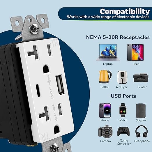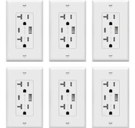 TOPGREENER USB Outlet, 20 Amp Type C USB Wall Charger Outlet, Tamper-Resistant Receptacle with 2 USB Charging Ports for iPhone 15 Series & More, Wall Plate Included, TU22036AC-W-6PCS, White, 6 Pack